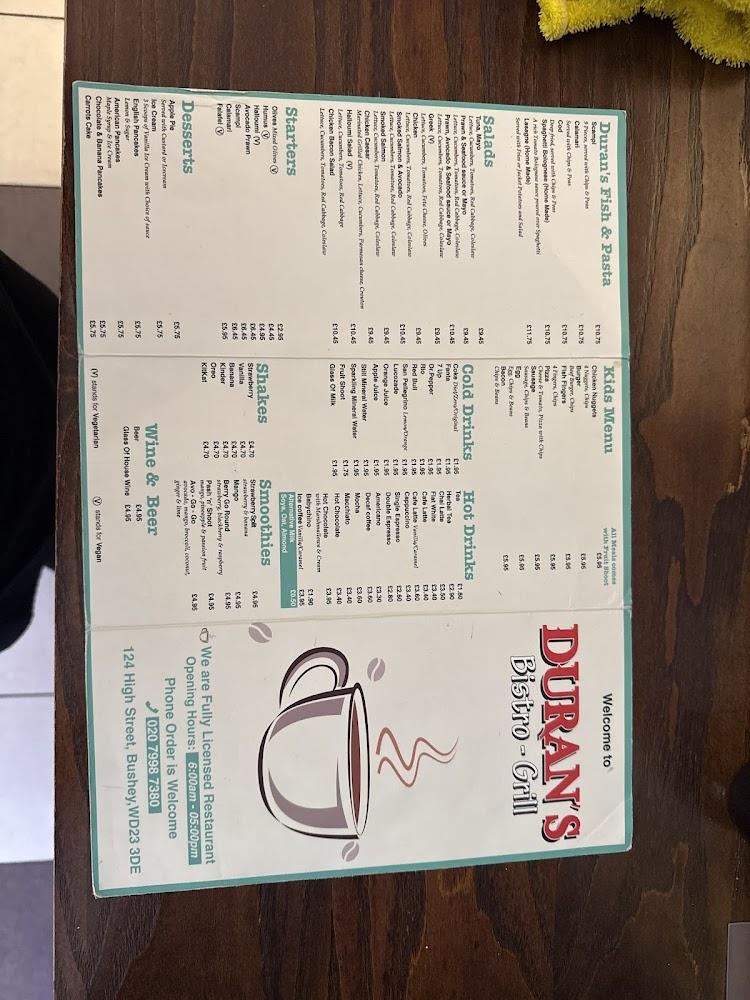 Situated at 124-126 High St, Bushey WD23 3DE, Duran's Bistro Grill stands as a community gem where everyone feels at home. The casual yet cosy atmosphere makes it the go-to place for group gatherings, solo work sessions, or leisurely meals. Duran's Bistro Grill boasts accessibility features, ensuring everyone can partake in the culinary delights offered. Families appreciate the kids' menu, with options like Chicken Nuggets and Pizza that cater to younger tastes. With outdoor seating available, patrons can savor their meals surrounded by the vibrancy of the local street life. This spot is known not only for its impressive food variety but also for its commitment to excellent customer service, making it a favorite among locals.